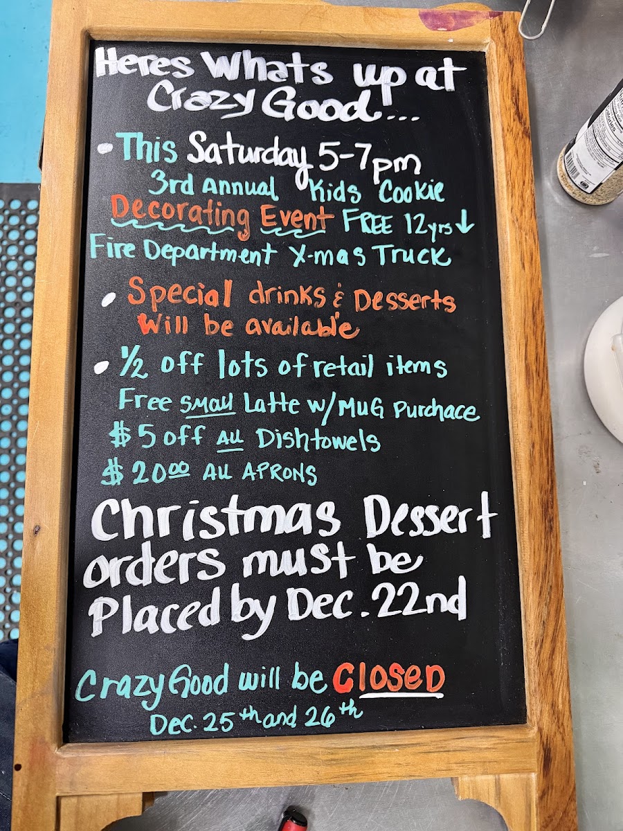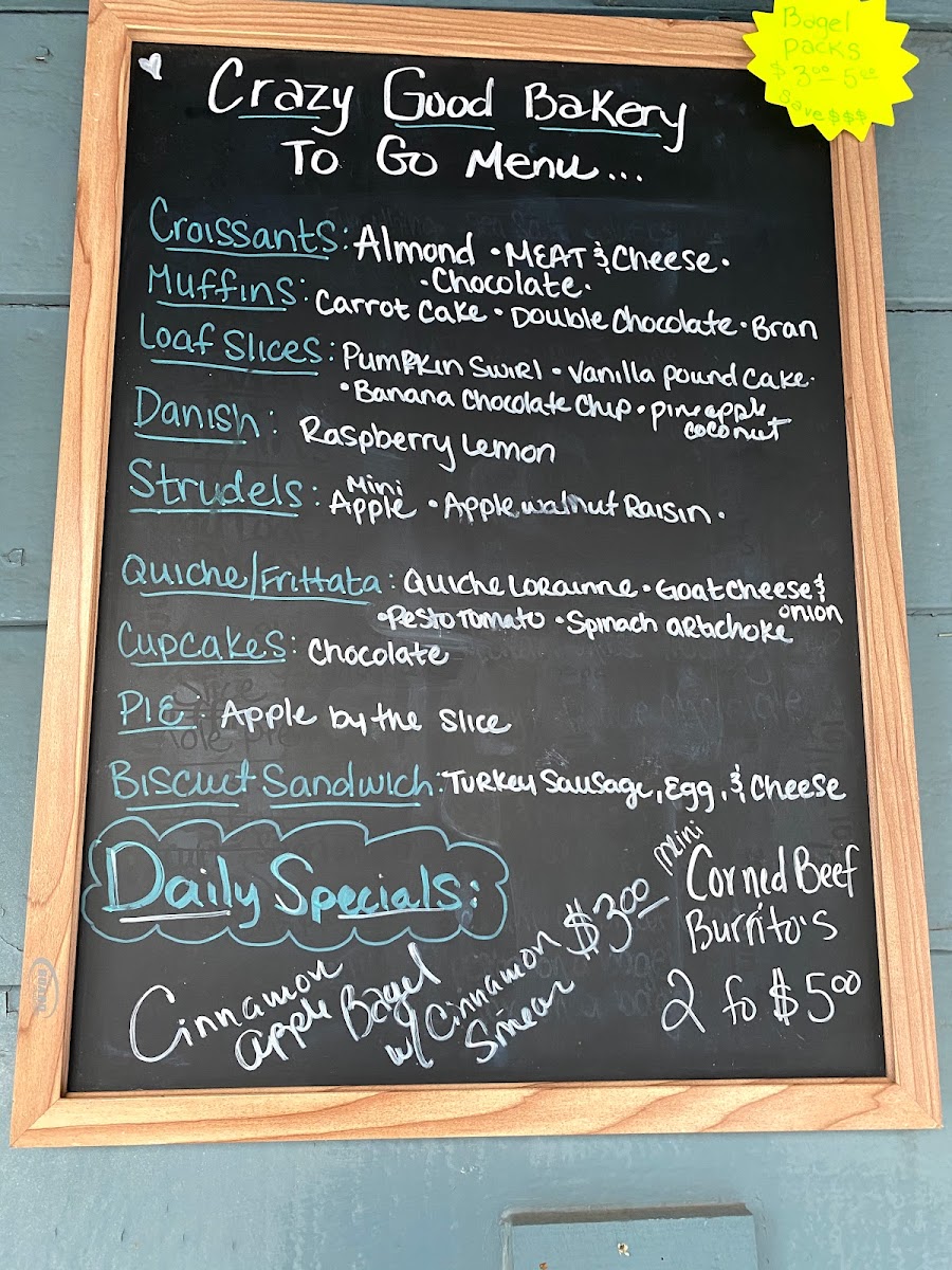 The menu at Crazy Good Bakery And Cafe features a selection of baked goods, sandwiches, and coffee beverages designed to suit various daytime occasions such as breakfast, coffee breaks, and light meals. Visitors can expect options that range from pastries and sweets to savory items and specialty drinks.